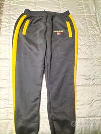 Vendo pantaloni joggers neri con bande laterali gialle, da uomo. Riportano il logo Napapijri sulla parte superiore della gamba sinistra. Sono di cotone felpato. In vita hanno l'elastico con l'accetto per regolare la larghezza in vita.