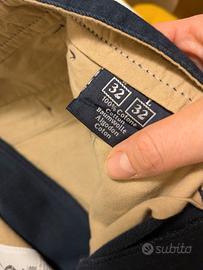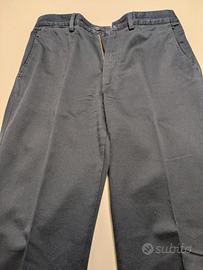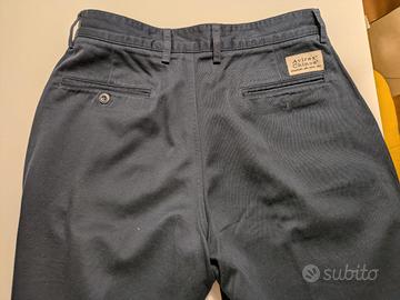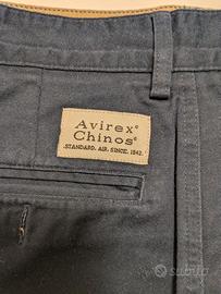 Pantaloni uomo Avirex Chinos blu scuro, con tasche laterali davanti e due di dietro. Taglia 32 (circa 48 italiana). 100% cotone, non elasticizzato. Non pesantissimi, da mezza stagione. Praticamente nuovi, messi una volta, manca un bottone nella tasca destra dietro, ma era già così all'acquisto.