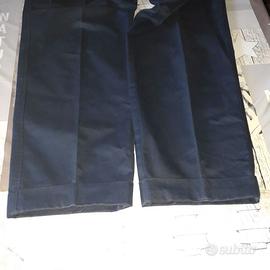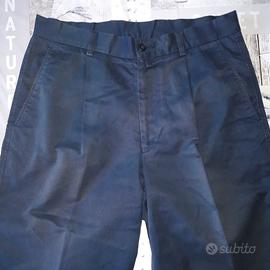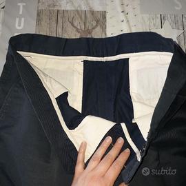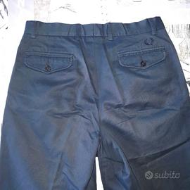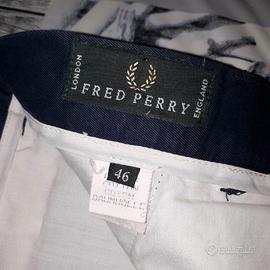 Pantaloni uomo tipo chino, marca Fred Perry, taglia 46, colore blu scuro. Tasche laterali. Tasche sul retro a soffietto. Chiusura con cerniera e bottone. Passanti per cintura.
