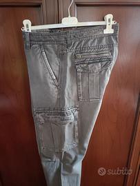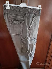 Pantaloni Celio cargo grigi uomo in cotone, chiusura anteriore bottoni, 2 tasche anteriori oblique, applicazione sul dietro, 2 tasche posteriori con patella, 2 tasche con patella laterali altezza ginocchio di cui una con scritte ricamate, taglia 46.