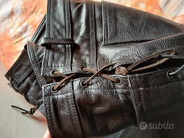 Pantaloni uomo in vera pelle tg. 52. Pari al nuovo. Fodera interna fino al ginocchio. La misura della vita è cm. 50, c'è la possibilità di allargare/stringere 1 cm. grazie ai lacci in cuoio. Bellissimi, taglio blue jeans, un vero affare.