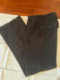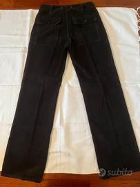 Pantaloni in velluto a coste United Colors of Benetton, taglia 38 IT, colore nero, 100% cotone. Modello a gamba larga, tasche davanti con taglio obliquo, 2 tasche dietro chiuse con bottone, passanti in vita. Molto comodi. Ottime condizioni tranne etichetta interna un po’ rovinata. Misure: vita 34 cm, lunghezza 101 cm, caviglia 23 cm. Made in Italy