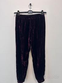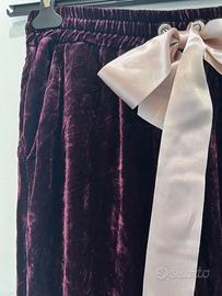 Pantaloni Pinko, modello jogging, elastico in vita e sul fondo, bordeaux con coulisse in raso rosa.