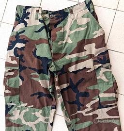 N331) Ottimo paio di pantaloni U.S. Army vintage in mimetismo woodland produzione originale americana Truspec - Georgia. Taglia riportata Large Regular. Queste sono le principali misure: lunghezza totale pantalone cm. 112 - girovita (eventualmente restringibile con le cinghiette laterali) cm. 89 - cavallo (da inguine a fondo del pantalone) cm. 80 (NB: nessun impegno su misure, vestibilità ecc., cedo esclusivamente come oggetto da collezione, grazie), doppia etichetta presente. Mai usati. si presentano in condizioni eccellenti.