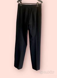 Pantaloni vintage, a vita alta, a palazzo, gamba dritta / ampia. Tinta unita colore nero. Tessuto caldo e morbido, leggero e compatto, al tatto sembra fresco lana. Sono tuttavia assenti etichette con la composizione del tessuto, è presente solo quella con la taglia. I pantaloni potrebbero essere infatti sartoriali, non foderati. Ottime condizioni vintage, nessun segno di usura o del tempo evidente. Taglia indicata 46 ITA (= 42 EUR, XL). MISURE: vita 38 cm circa; cavallo (davanti fino alla cucitura 30,5 cm circa; fianchi 51 cm circa; coscia altezza cavallo 31 cm circa; caviglia 24 cm circa; lunghezza totale 108,5 cm circa (si potrebbero allungare di 3 cm circa).