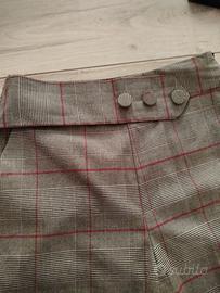 Pantaloni a vita alta, gamba ampia in Principe di Galles,fascia in vita con 3 bottoncini, chiusura laterale con lampo, tasche anteriori e 2 taschini posteriori finti. Mai indossati Nuovi.