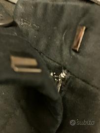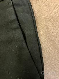 Cotone rasatello. Vita bassa. Taschine laterali e dietro. Al fondo finiscono con un lavoro tipo pizzo.