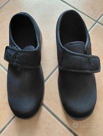 Pantofola post-operatoria per riabilitazione o per anziani con difficoltà motorie, realizzate in tessuto elasticizzato traspirante per il confort di qualsiasi piede, sia gonfio che deformato e con una perfetta aderenza per evitarne un'incidentale fuoriuscita, suola in gomma antiscivolo. chiusure a strappo in velcro per una maggiore adattabilità al piede