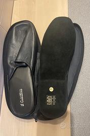 Bellissime pantofole da viaggio in vera pelle nera di alta qualità, col logo "il Ciabattino" manifattura Made in Italy, con particolare attenzione al comfort e alla durata. Caratterizzate da struttura morbida e richiudibile all'interno della custodia coordinata con cerniera. Modello pensato per la massima praticità in viaggio. Design compatto e flessibile che permette di riporle ordinatamente nella custodia salvaspazio. Misura 43. Ottima idea regalo. Nuove, mai usate, ancora nell’imballo originale