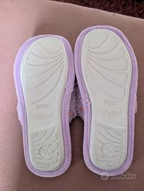 Vendesi comode pantofole lilla del marchio italiano De Fonseca. Modello: ciabatta chiusa invernale da donna, realizzata in un morbido tessuto effetto ciniglia di colore lilla, decorata con piccoli cuoricini ricamati rosa ed arancioni sulla tomaia. Materiale: Tessuto morbido e caldo, spesso con una costruzione interna a più strati per garantire maggiore comfort e leggerezza. Caratteristiche: Suola in gomma antiscivolo adatta per i pavimenti di casa. Mai usate, vendo per inutilizzo (v. foto interni + suole) Prezzo trattabile Nota: Erano vendute sciolte, senza scatola. Pertanto, verranno spedite in una confezione non corrispondente al marchio delle pantofole