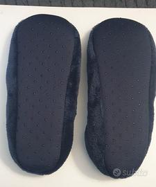 Coppia di pantofole da donna, morbide e confortevoli, un paio di pantofole in tessuto felpato blu e un paio di pantofole a righe rosse e nere con fiocco, etichettate come "Antiscivola", numero 36.