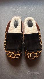 Vendo eleganti pantofole–sabot da donna, realizzate in cavallino con fantasia animalier e dettaglio frange nere sul davanti.