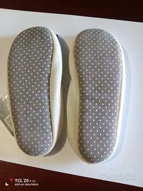 Pantofole donna, tipi " ballerine" n 36/37. Morbide, antiscivolo, color panna con interno e fiocchi blu a pois. Marca Esmara. Nuove, con cartellino, vendo per sbaglio di numero