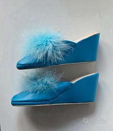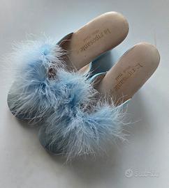 Pantofole Vintage anni 70- La Riposante originali -vera pelle-con piuma di cigno- disponibile in celeste o azzurro- mis.37