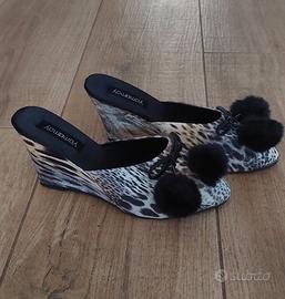 Deliziose pantofole Yamamay stampa leopardata e interno in raso nero, nuove con cartellino e borsina originale di tulle nera. Zeppa alta 9 cm, lunghezza pantofola misurata dall'interno e' 24 cm