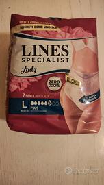 Vendo perché non servono più 9 confezioni da 7 pants ciascuna di Lines Specialist per donna, taglia L, livello di assorbenza 7.