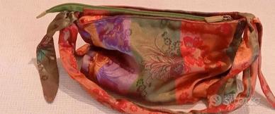 Elegante borsa a Paola C in raso poliestere con vivaci motivi floreali nei toni di rosa, arancio, verde e viola.