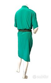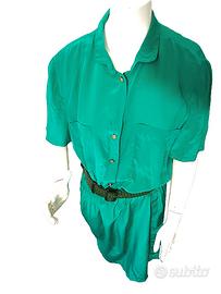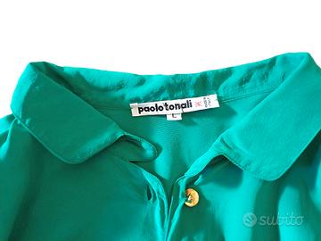 Abito chemisier Paolo Tonali, Made in Italy, 100% seta pura, color verde smeraldo/turchese brillante. Colletto classico tipo polo con chiusura a 4 bottoni dorati con logo inciso, maniche corte, vita elasticizzata sotto il petto effetto impero, due tasche al petto, lunghezza midi al ginocchio, cintura in corda intrecciata verde.