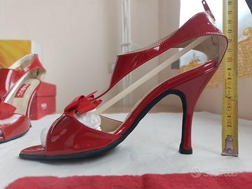 Iconico modello "Caricia" (fuori produzione), n.37, spettacolare e di grande effetto in vera pelle verniciata rossa, fodera e sottopiede in vera pelle scamosciata, punta poggiadita in vera pelle verniciata, suola in bufalina (non adatta all'uso esterno), chiusura posteriore con zip sul tallone, fiocco decorativo sulla mascherina, con scatola e dustbag originali.