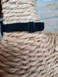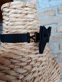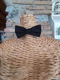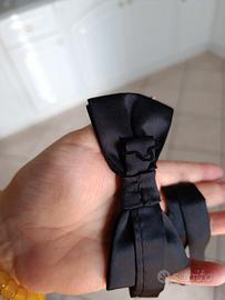 Papillon nero lucido, tipo raso. Mai usato. Vendo per inutilizzo. Cinturino morbido al collo, con regolazione della lunghezza. Facile da mettere e togliere, grazie al gancetto laterale che rimane dietro al fiocco.