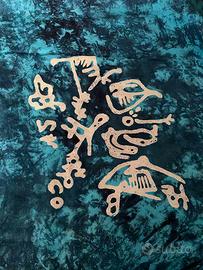 Pareo da mare ampio e morbido, copricostume in stile etnico, 100% rayon (viscosa), color turchese con disegni bianchi. Ha una forma rettangolare con piccole frange sull'altezza. Dimensioni: lunghezza 162 cm e altezza 118 cm circa, made in Indonesia. Misura unica. Nuovo con cartellino.