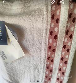 Pareo in spugna tinta unita bianco con balza jacquard stampa digitale disegno a cuoricini bordeaux e rosa