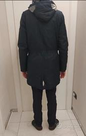 parka blu. tasca interna, due tasconi esterni con cerniera, due tasche superiori esterne. cappuccio.
