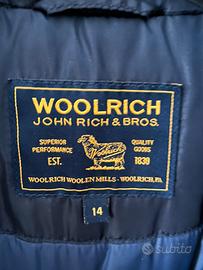 Parka Woolrich da ragazza, taglia 14 anni, colore blu scuro. Originale e mantenuto in ottime condizioni. Unico difetto: si è scolorita la scritta esterna sulla manica. Imbottitura calda, ideale per l’inverno, colletto in eco-pelliccia, chiusura con zip + bottoni, 4 tasche (2 con zip e 2 con pattina). Tessuto resistente e di alta qualità, tipico di Woolrich