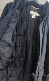 Parka H&M blu con cappuccio e pelliccia sintetica. - Chiusura con bottoni. - Tasche frontali con patta. - Coulisse in vita.