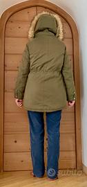 Parka da donna con interno in montone sintetico, taglia XS, colore verde militare scuro, molto caldo ma non troppo pesante, con zip e bottoni, tasche esterne, pelliccia del cappuccio staccabile, regolabile in vita. Ottime condizioni!