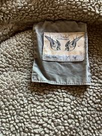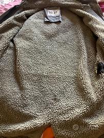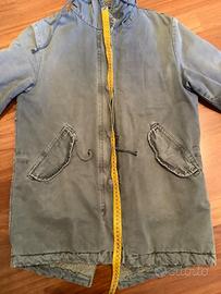 Taglia M, misure in foto. Cappuccio, coulisse in vita interna. Fodera in eco pelliccia. Doppia chiusura antivento. Tasche davanti. Nessun difetto. Colore verde militare effetto delave’