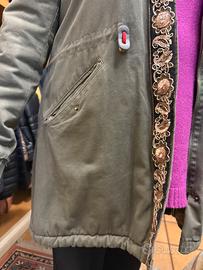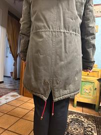 Parka verde con rifiniture nelle tasche e lungo la cerniera , pello interno e nel cappuccio ! Taglia M