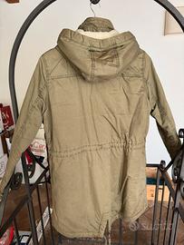 Colore verde militare, taglia XL, lunghezza fino alla gamba, con cappuccio e coulisse per stringere la giacca in vita.