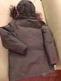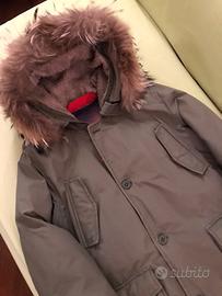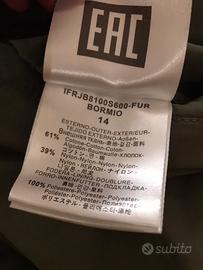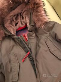 Parka in cotone e nylon tecnico verdone. Tg Small adatto a ragazza 14 anni o donna tg 40IT/ Small. Imbottitura termica e fodera con stampa. Cappuccio con interno in pile e bordo staccabile raccoon vero. Polsino in maglia anti freddo. Chiusura con zip e bottoni. Tasche scalda mani e tasche con altra e bottone a doppia entrata. Adatto anche a basse temperature. Ottimo stato