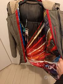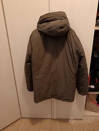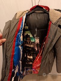Parka in tessuto di misto cotone con finitura antipioggia e antivento, imbottito in 50% piumino e 50% piuma. Cappuccio fisso con vera pelliccia removibile, chiusura con cerniera a doppio cursore nascosta da pattina con bottoni, due grandi tasche applicate con pattina e bottone, due tasche scaldamani con pattina. Coulisse interna di regolazione della vita.