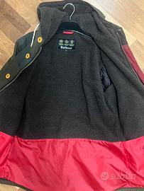 Rivestimento cerato, fodera in finto shearling, cappuccio con coulisse, tasche frontali con patta, due tasche diagonali laterali, bottoni goffrati color oro, maniche lunghe e chiusura frontale con bottoni e zip.