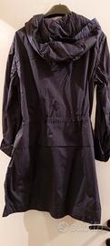 Parka GEOX in crinckle di nylon, tessuto goffrato super leggero e brillante, idrorepellente e resistente al vento, taglia 46, colore Gothic Blue, nuovo con cartellino. Manica lunga che può essere arrotolata a 3/4 e fissata con un bottone. Il cappuccio fisso è ampio, la chiusura è con zip. Il capo è sfoderato, e profilato internamente con tessuto a motivo camouflage, la coulisse in vita è regolabile.