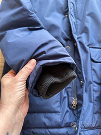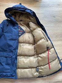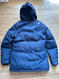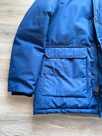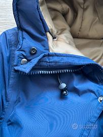 Giacca invernale pesante termica, imbottita, taglia M morbida, colore blu (la foto risulta più accesa rispetto al colore reale) maniche con polsino, cordino interno facoltativo, chiusura con zip (doppia apertura) e bottoni, dotato di cappuccio, 4 tasche, Costo di acquisto 365 euro. Usato poche volte. Il modello è donna ma volendo può essere unisex