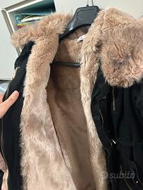 Vendo bellissimo parka nero con pelliccia rosa. La pelliccia può essere tolta e rimessa e viene fissata attraverso cerniere interne e viene agganciata fino alle maniche e al cappuccio con dei bottoni. Ha due tasche esterne, una si è leggermente scucita, ma si può tranquillamente aggiustare.