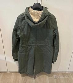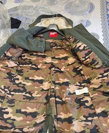 Barca a coda di rondine, marca Playlife imbottita interno Camouflage, con cappuccio con interno pelo riccio panna zip a doppio cursore