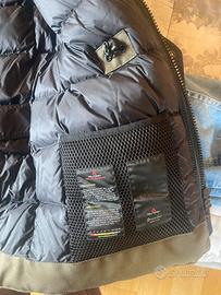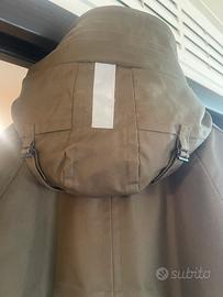 Ampio parka costruito con un ordito doppio ritorto e una trama ad alta tenacità, imbottito in piuma naturale. Tasche laterali con patta, coulisse interna e ampio collo in piedi con cappuccio fisso in vera pelliccia. Il capo è arricchito dal cappuccio over con tiranti regolabili. Iconica patch logo ricamata sulla manica sinistra.