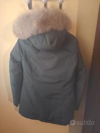 Parka imbottito verde militare con cappuccio in pelliccia indossato una volta praticamente nuovo taglia XS ma veste anche S pagato 170 quindi regalato prima della consegna lo porto in lavanderia faccio un po' di sconto