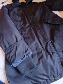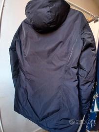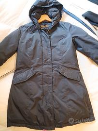 Giacca Woolrich usata, invernale, impermeabile, blu scuro, taglia S, modello leggermente sciancrato, aderente sui fianchi. Lunghezza da spalla circa 80 cm.