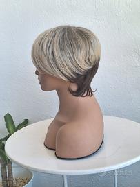 Parrucca corta bionda con base scura. Capelli in fibra sintetica, setosi dall'aspetto naturale resistenti al calore e traspirante, facile da indossare. Puoi lavare e asciugare con il phon.
