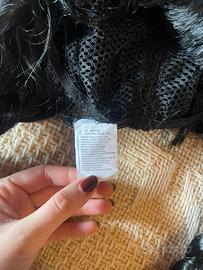 Parrucca stile Mercoledì Addams per adulti, usata una sola volta. Capelli sintetici neri con frangia e due lunghe trecce, ideale per completare un costume dark/gotico o per feste a tema Halloween e Carnevale. Realizzata in 100% poliestere, leggera e confortevole da indossare.