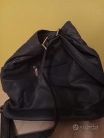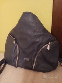 particolarissima borsa zaino in similpelle colore blu marino, marchio Coveri collection. indossabile sia a spalla, sia come zainetto triangolare sfruttando i doppi spallacci. ricco di tasche, come nuovo