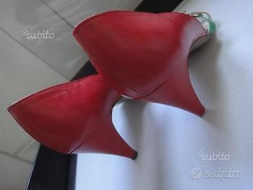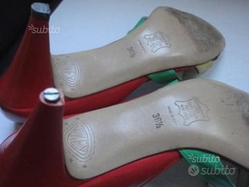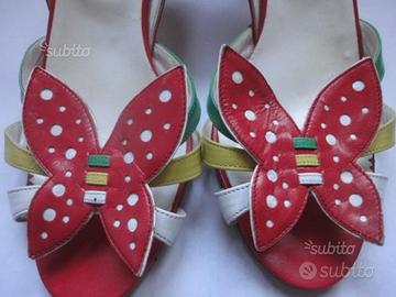 Particolari Scarpe Rosse n° 36.5 marca Neri con Farfalla e strisce colorate in bianco, giallo e verde , tacco 8 cm., la pelle è di capretto e la suola in vero cuoio. Sono scarpe degli anni 70 Usate poche volte come si vede dalle foto, manca un tacchetto di gomma.