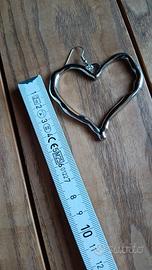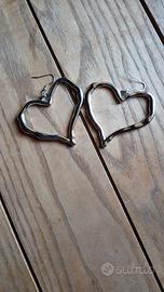 particolare set composto da lunga collana regolabile secondo annodarura con ciondolo a forma di cuori in abbinamento a grandi orecchini il tutto color argento