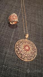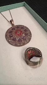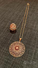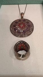 Bellissima parure collana + anello in argento 925 placato oro rosa, con dettagli in filigrana nei toni del rosa e del viola. Lunghezza catenina della collana 40 cm Anello estensibile per misure diverse, con leggero segno come in foto. Non vendo separatamente