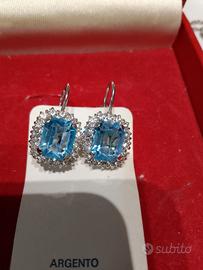 Orecchini a perno d'argento a goccia con pietra quadrata azzurra circondata da punti luce.